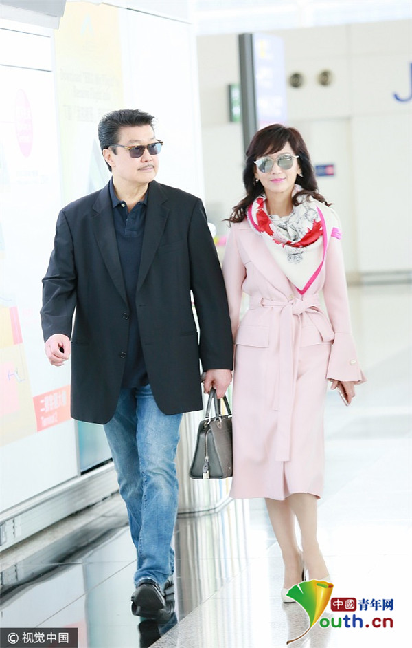 赵雅芝粉色大衣成功减龄 与老公牵手同行恩爱如初