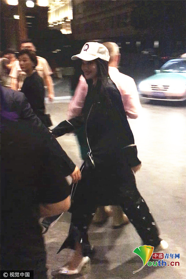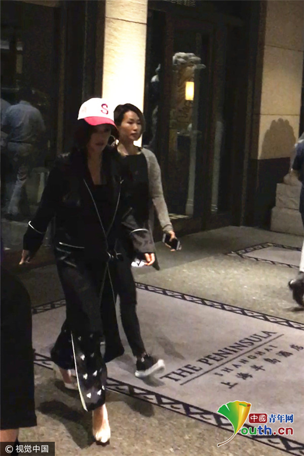 2017年5月14日,上海,舒淇睡衣棒球帽潇洒现身某酒店。舒淇街拍,头戴白色棒球帽,身穿黑色缎面长款V领长袖睡衣,下穿黑色印花图案开叉宽松阔腿长裤,脚穿白色细跟浅口高跟鞋。