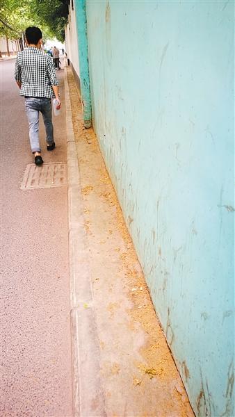 5月14日,按照群众指引,记者来到位于西影路小学旁新开门路北段的这处人行道,顺着新开门路朝北走,路两边都是宽约五六米的人行道,行人都能正常行走,走了100多米后,人行道就被一堵围墙所挡住,围墙旁留下了一条20多厘米宽的人行道。“你看看,这么窄的人行道怎么走,走上去就像跳舞一样!”市民刘大妈说,“不信可以走上去试试”。随后,记者实地体验了一下,由于旁边有围墙挡住,无法支撑身体平衡,走不了多远就从人行道上掉下来。记者采访中发现,这处被占用的人行道长约百米,但最宽处也就20多厘米,最窄处不足10厘米,只能放下一部手机,不少群众走到这段路时,只得改走机动车道。