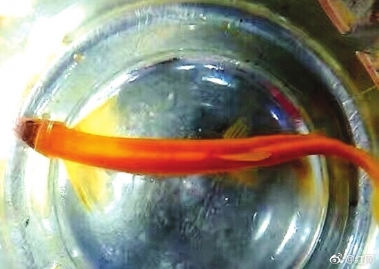 通过网友提供的图片记者看到,这条泥鳅长约15厘米,除了鳍是黄色的,身体其他部分呈金黄色。有网友表示,这条泥鳅像条鱼,也有人说,这是一条“金鳅”。