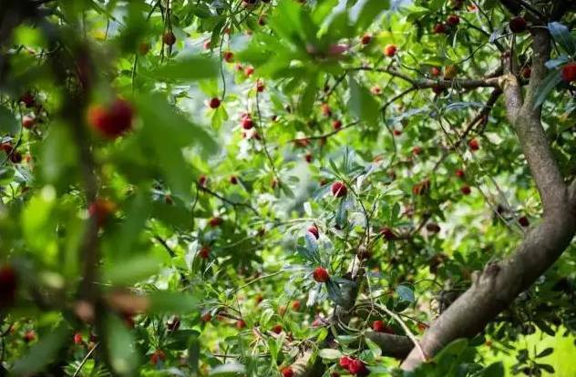 在林中,随处可见硕果累累的杨梅挂满枝头,
