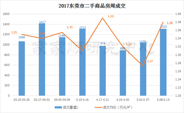 东莞上周二手商品房成交量价齐升。据家家顺监控数据显示,上周成交二手商品房1310套,环比增长26%;成交均价1.38万元/㎡,环比上涨8%。