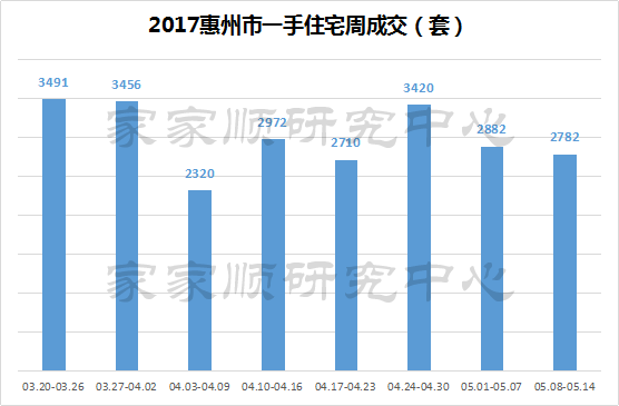 家家顺研究中心监测数据显示,上周(05.08-05.14)全市一手住宅网签成交2782套,环比下跌3.5%。