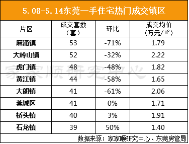 从镇区成交情况来看,各片区分布较为平均,水乡片区麻涌镇以成交53套位列第一,但成交量环比减少71%;大岭山镇成交均价2.22万元/㎡位列第一。