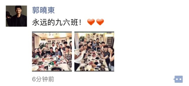 5月19日晚,演员郭晓冬在朋友圈晒出两张和北电96级表演系同学聚会的合照,配文“永远的九六班”和两个红心。图上几乎个个都是大明星:何琳、许还幻、陈坤、孔维、郭晓冬以及《还珠格格》中的“塞娅公主”张恒(第一张照片从左往右),被大伙儿簇拥在中间的则是班主任崔新琴。若再加上赵薇黄晓明几乎就是全班大聚会,不愧是北电历史上最著名的“明星班”。