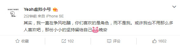 5月23日,郑爽再次在微博发感慨,“其实,我一直在争风吃醋,你们喜欢的是角色,而不是我。或许我也不用那么多人喜欢吧,那份小小的坚持留给自己,晚安!”几分钟后,郑爽删除了该微博。