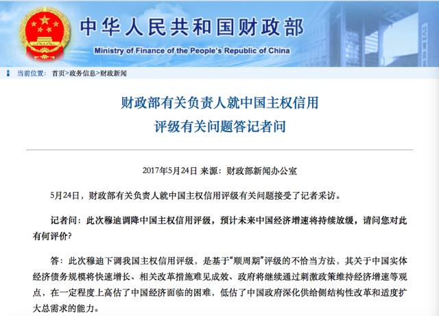 5月24日,财政部有关负责人就中国主权信用评级有关问题接受了记者采访,表示:穆迪所谓的地方政府融资平台、国有企业等债务水平持续增长会增加政府或有债务的说法,是根本不成立的。