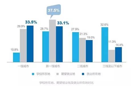 值得注意的是,此次调查显示,一线及新一线城市仍然是今年应届毕业生选择的主要就业地。