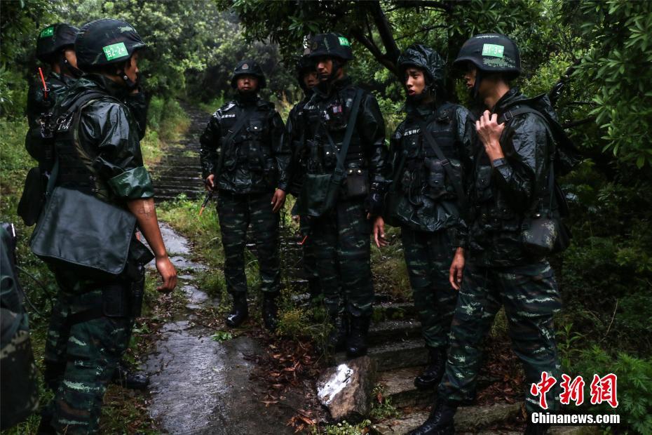 5月24日,官兵们正在训练雨中急行军。当天,武警浙江总队组织直属、舟山、宁波、台州等四个支队特勤分队在舟山开展第二季度“魔鬼周”极限训练。据悉,此次“魔鬼周”训练设置了武装奔袭、山地越野、荒岛求生、夜间行军和各种枪械射击等课目。中新社记者殷福军 摄