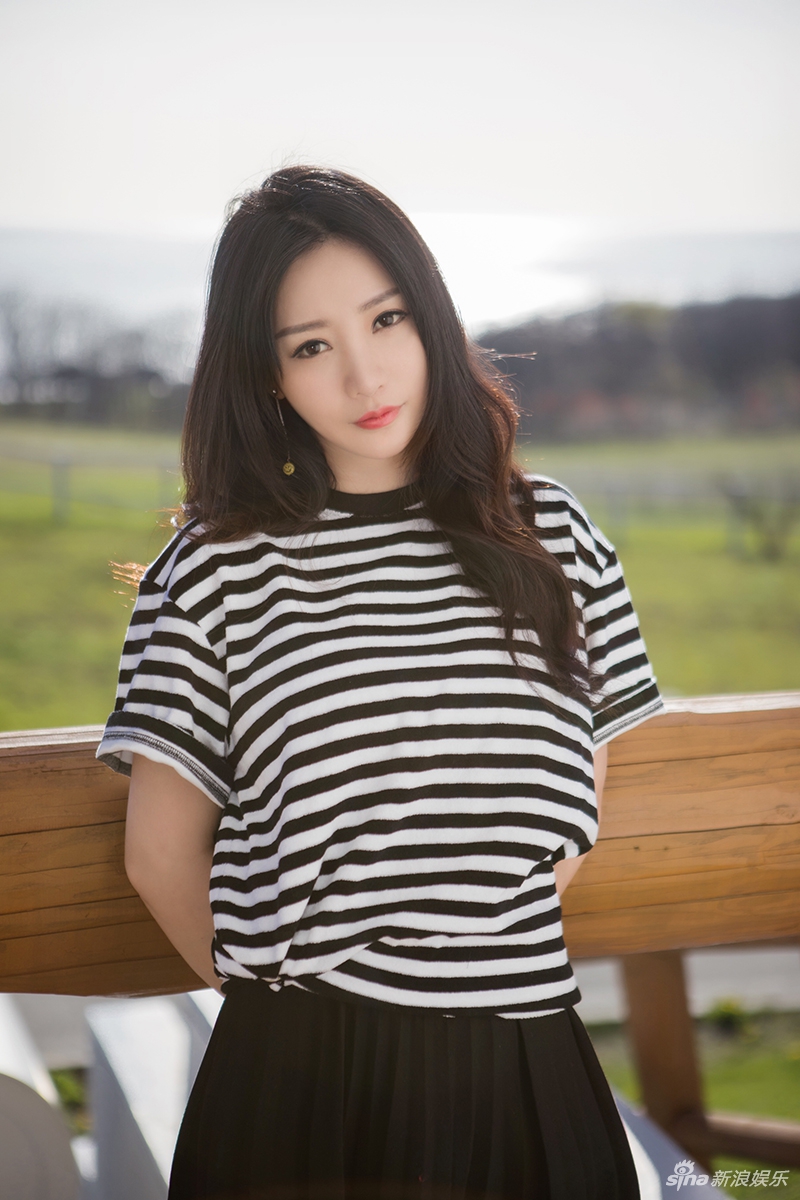 柳岩黑白条纹T恤藏不住傲人身材 甜笑似少女