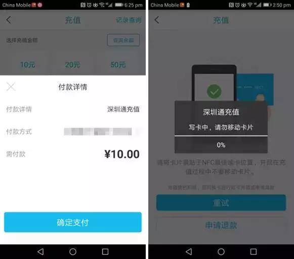 需要充值时,选择要充值的金额进行支付,然后贴卡进行充值即可。如果充值失败,会提示再次“重试”或者“申请退款”,申请退款可以实时将未充值成功的金额退回市民通账户内。