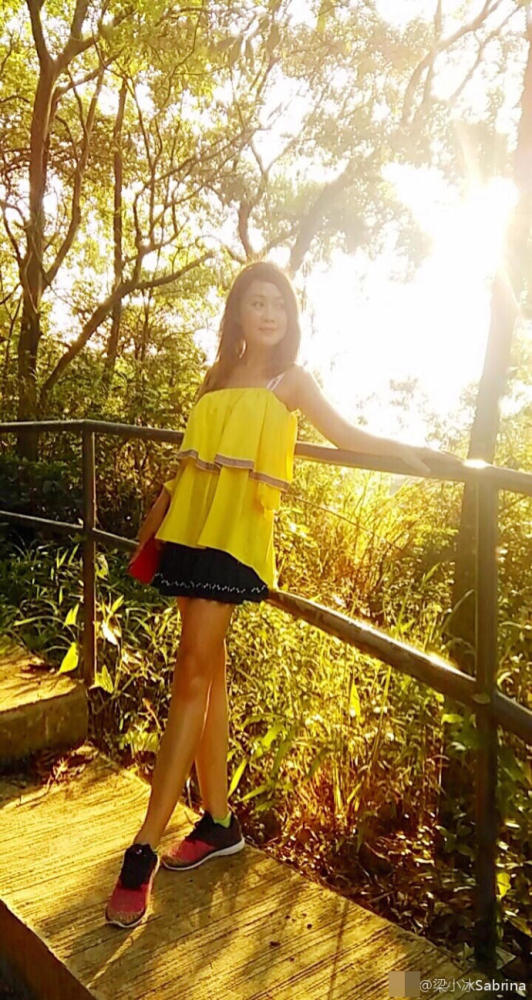 梁小冰置身绿色大森林,在晨光的映照下整个人神采奕奕,大长腿也十分抢镜。