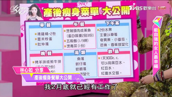 林心如的产后瘦身餐首度曝光:早餐是滴鸡精两包、姜末炒蛋和杜仲汤;午餐是烫猪颈肉或蒸鱼(蛋白质要2到3份),五谷饭(1/3碗)和烫青菜;下午茶是2份水果,主要以草莓、奇异果、小西红柿、番石榴和香蕉为主;晚餐是烤羊排或煎牛排(蛋白质2份)和烫青菜;汤类则是鱼汤、蚵仔汤、蛤蜊汤;饮品则是一天300cc的黑豆、红豆或是红枣水。