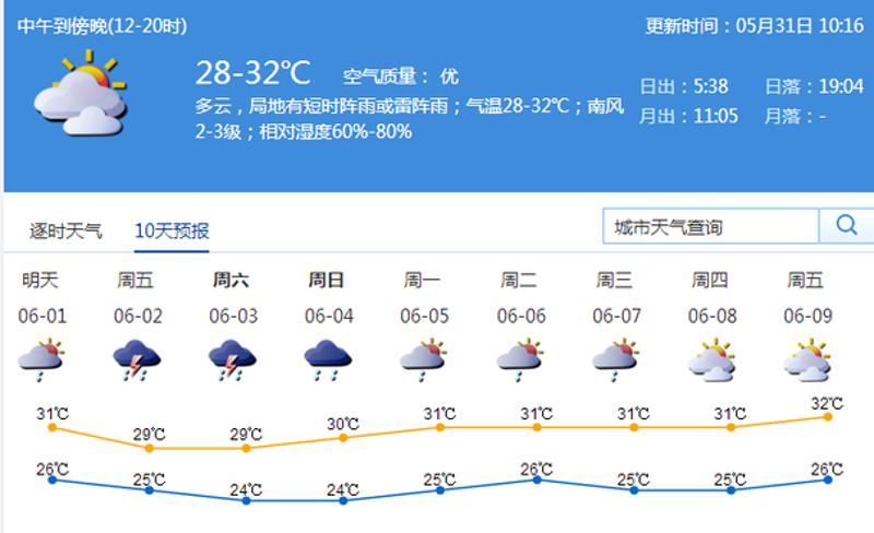 深圳市气象台2017年05月31日16时00分发布,31日气温25-31℃,偏南风2-3级,空气相对湿度60%-95%,未来一周多降雨,1日多云有阵雨或雷雨,有时雨势较大,气温26-31℃ ;2-3日有雷雨,局部雨量可达暴雨量级;4-5日有阵雨,有时雨势较大;6-7日多云,有短时阵雨。