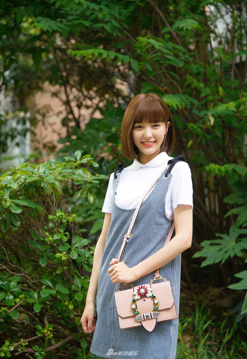 组图:唐嫣白T搭背带裙拍大片 清新阳光 美腿细长直