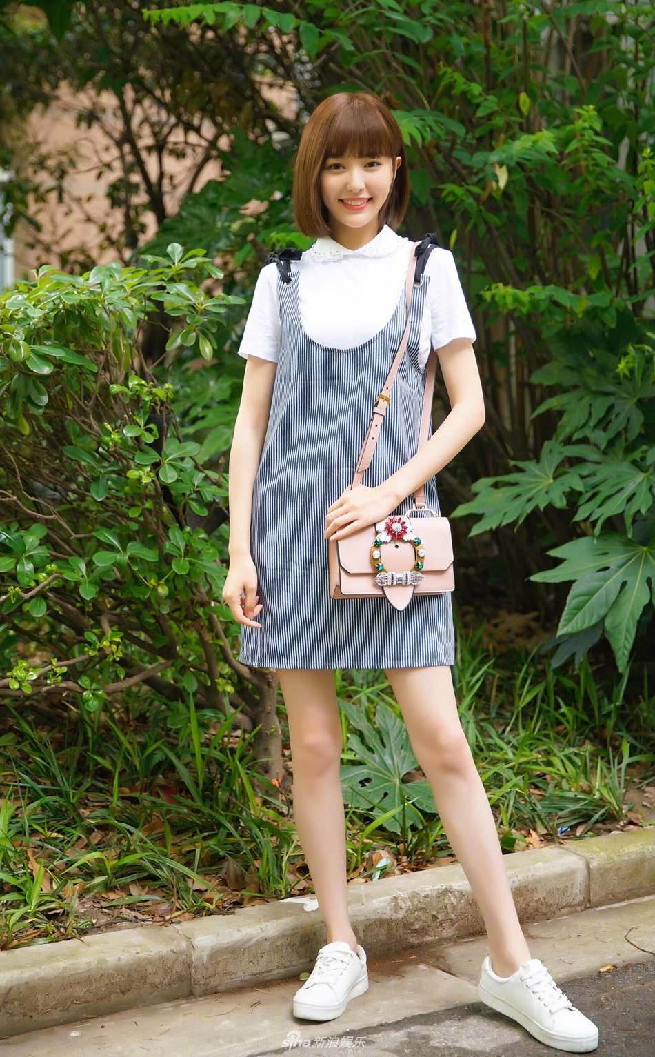 组图:唐嫣白T搭背带裙拍大片 清新阳光 美腿细长直