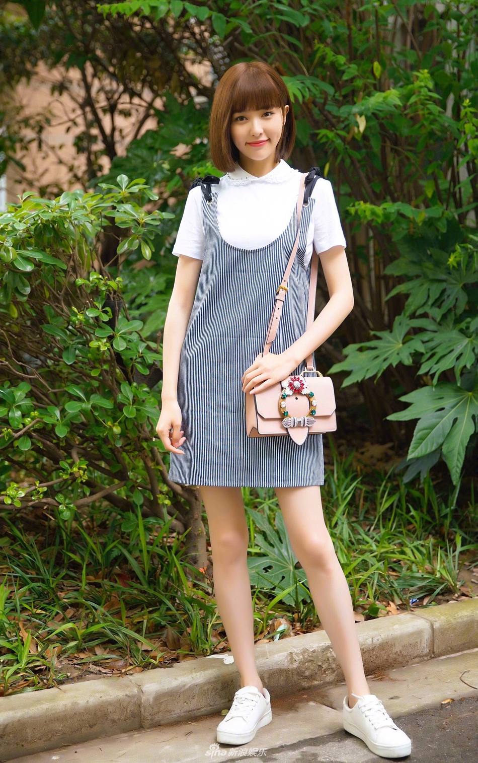 组图:唐嫣白T搭背带裙拍大片 清新阳光 美腿细长直