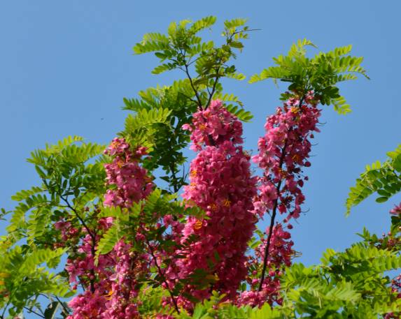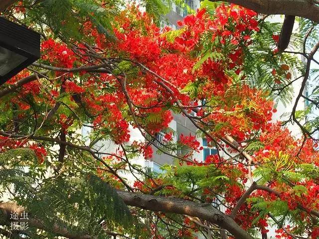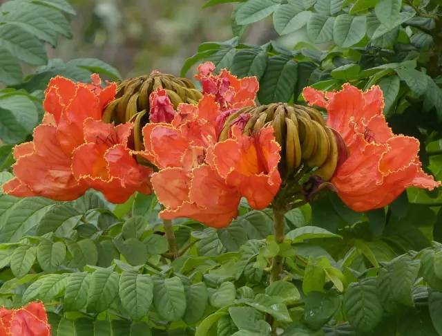 本种树冠呈广伞形,二回羽状复叶宛如大型羽毛。花繁盛,花冠鲜红色或橙红色。
