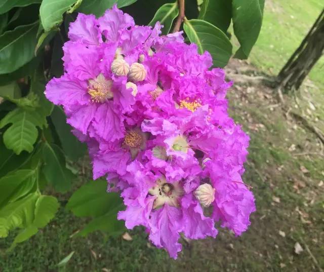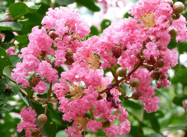 落叶小乔木,枝干光滑,树皮秋冬块状脱落。圆锥花序顶生,花有鲜红、粉红、紫色、白色不同系列。紫薇有个很有趣的特性,轻抚枝干全树会动,因此被称作“痒痒树”。