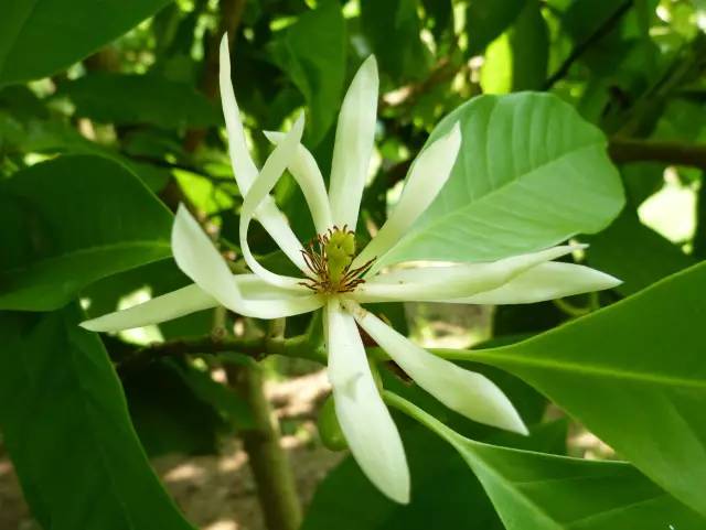 叶互生,长椭圆形或椭圆状披针形。花单生于叶腋,花被片10枚以上,披针形,白色,芳香。