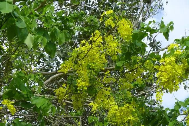 总状花序下垂,花冠鲜黄色。荚果圆柱形,果熟时呈黑褐色,酷似农家晒的腊肠,由此得名“腊肠树”。