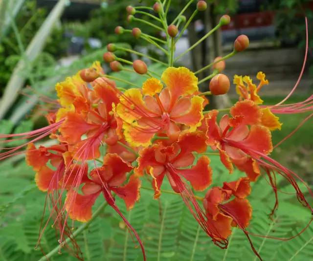 落叶灌木。总状花序顶生,花冠橙红色,边缘金色,皱波状,花丝红色,伸出花冠之外。荚果扁平。开花期间缤纷艳丽,花瓣似蝶翼,花丝似蝶须,远看宛如一群群彩蝶在绿叶中飞舞。