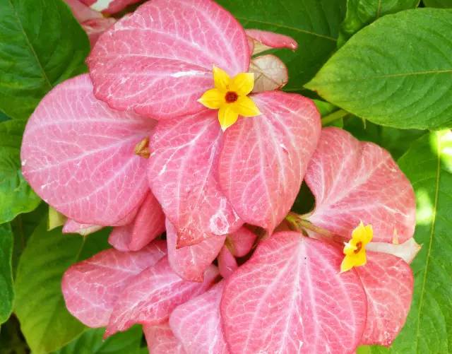 常绿灌木,伞房状聚伞花序顶生,花萼的5枚裂片均扩大呈粉红色花瓣状,花冠金黄色,檐部呈星形。分布区域:园艺杂交种,热带地区广为栽培。