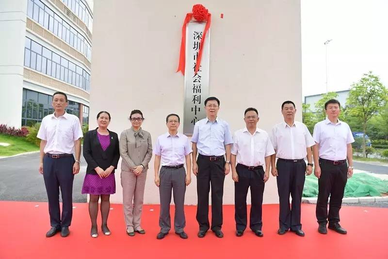 市政协副主席王璞、市政府副秘书长刘胜、市民政局局长廖远飞、市残联理事长侯伊莎、市建筑工务署副署长刘春乐、市妇联副巡视员王晓丹、龙华区委常委马里、市社会福利中心主任张斌为新址揭牌。