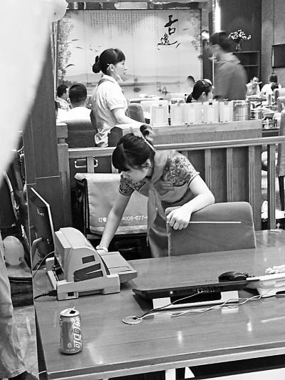 在王荣拍摄的现场照片中,服务员穿着红色或者白色的工作服在餐馆服务,进入镜头的服务员无一例外都带着红领巾。