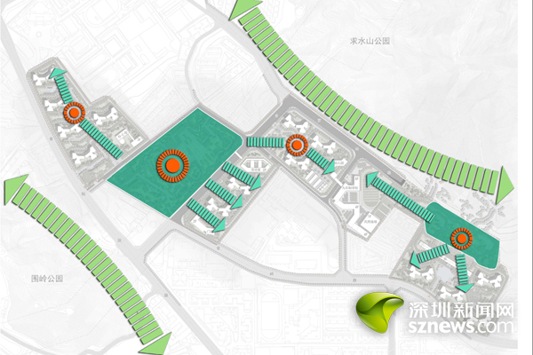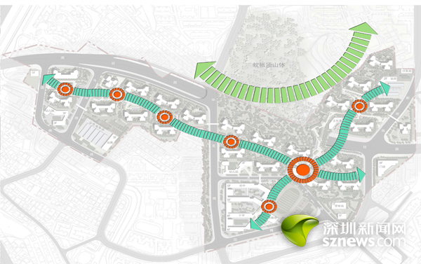 城市与自然的交融,也是此次概念设计的核心理念之一。根据方案,以木棉岭片区北侧的蚊帐顶自然山体为依托,打造两条贯穿园区的东西向景观带和南北向景观带,并布置多处景观节点,形成“一山、两带、多院落”的规划结构;而布心片区则以求水山公园和围岭公园两处自然山体为依托,以规划的两个景观公园为媒介,形成四个主要景观节点,多条视觉通廊,构成了“两山、四中心、双园、多通廊”的规划结构。