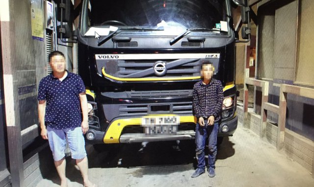 ▲被边检民警查获的藏匿货柜车车底偷渡人员(右)与驾驶该辆车司机(左)。黄俊生摄