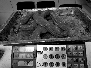 岳各庄海鲜市场,购一斤一两螃蟹,绳子占6两。