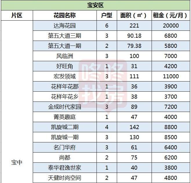 宝安区目前租金整体最高的区域为宝中,配套附加值较高,其次是各个片区的地铁沿线楼盘;由于宝安地铁线路覆盖较少,楼盘分化差异较大,地铁目前是租金高低的硬指标。