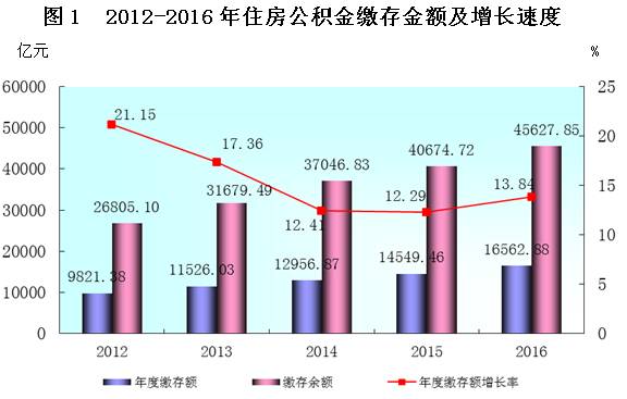2016年全国住房公积金缴存额为16562.88亿元,比2015年增长13.84%。到2016年末,住房公积金缴存总额106091.76亿元,缴存余额45627.85亿元,分别比2015年末增长18.55%和12.18%。
