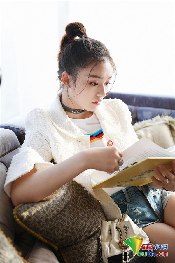 2017年6月7日,近日,林允在酒店闲暇时间看书,她坐在沙发上表情楚楚动人惹人怜,身穿牛仔热裤,露出一双白皙长腿。