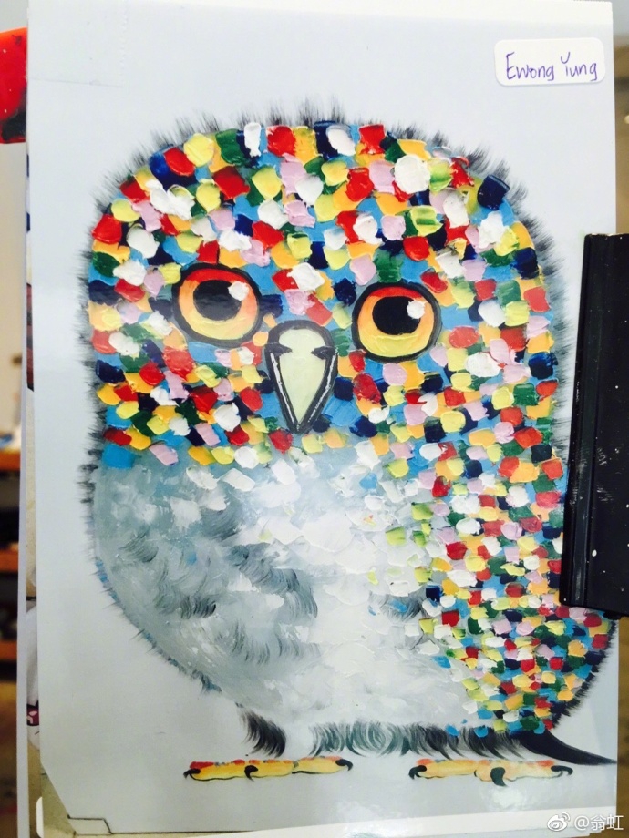 6月6日,翁虹在微博上晒出了自己的画作,她画的是一只猫头鹰,色彩斑斓,看上去萌萌哒!翁虹也开心出镜,皮肤白皙,青春似少女!