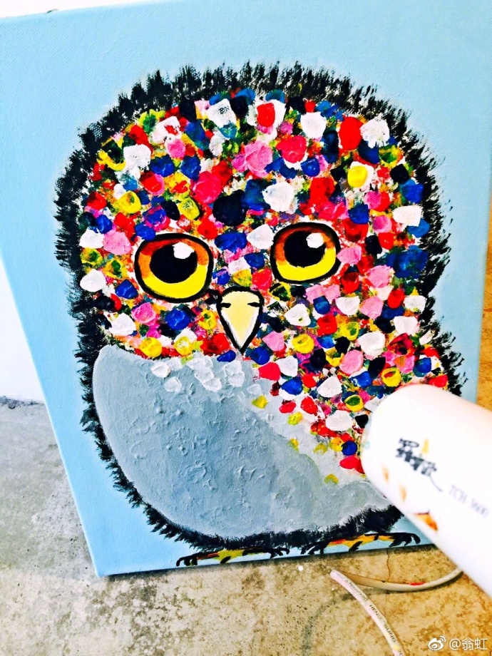 6月6日,翁虹在微博上晒出了自己的画作,她画的是一只猫头鹰,色彩斑斓,看上去萌萌哒!翁虹也开心出镜,皮肤白皙,青春似少女!