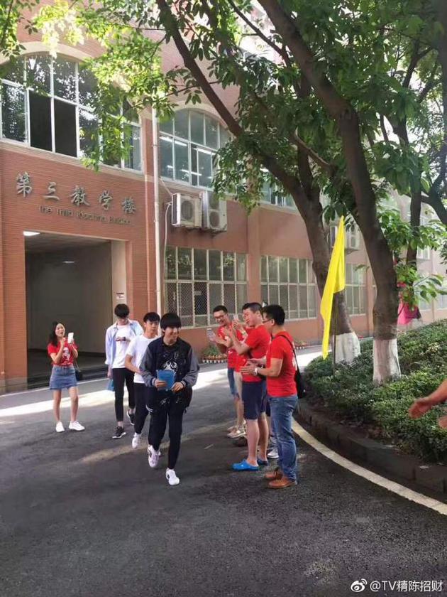 王俊凯被老师们穿红衣送考 笑容满面似信心十足