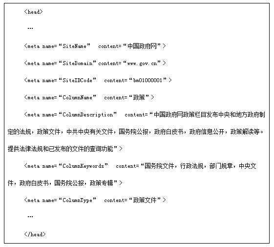 网页标签是指网页模版中对有关展现内容进行标记而设置的标签,通常包括网站标签、栏目标签、内容页标签等。政府网站要在页面源代码“〈head〉…〈/head〉”中以meta标签的形式,对网站名称、政府网站标识码、栏目类别等关键要素进行标记,标签值不能为空。