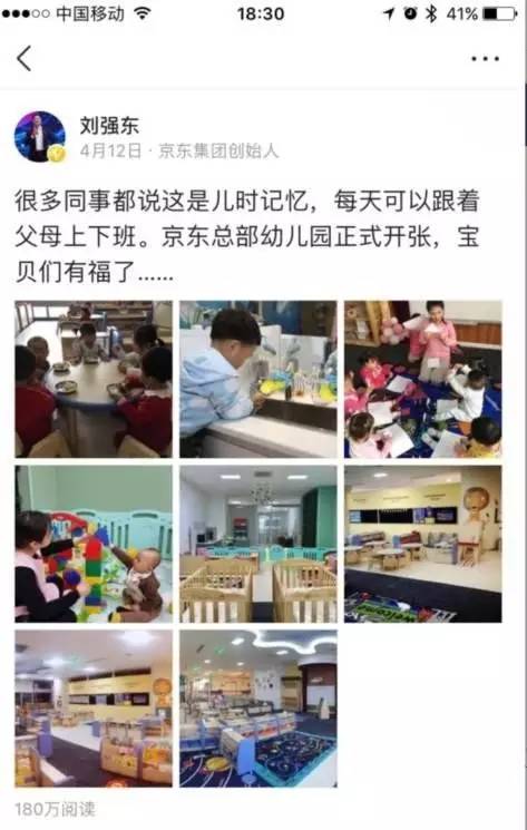 而在4月12日,刘强东更是在今日头条上发布消息称,京东总部幼儿园正式开张,名为“京东初然之爱托幼中心”, 对京东员工子女可免费入学,为宝宝们提供的母婴产品也都是免费的。据新浪科技消息: