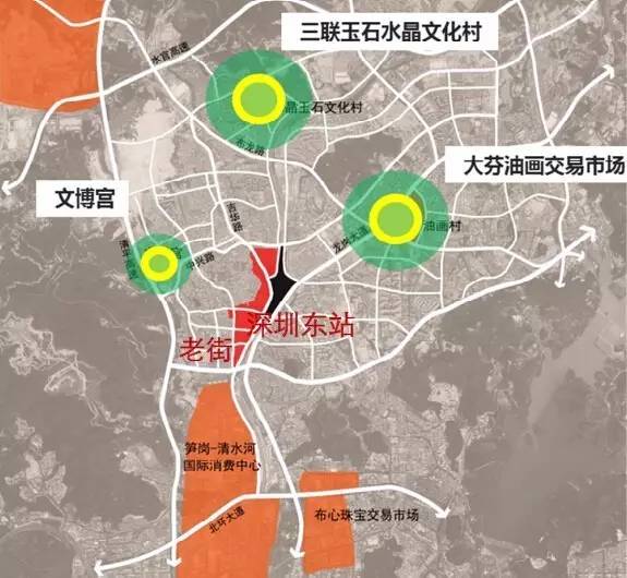 布吉老街片区方圆3公里半径内拥有5大专业市场,包括大芬油画交易市场、水贝田贝珠宝产业基地、笋岗清水河工艺品家居市场、华为电子通讯市场提供集中展示和交易场所,毗邻东站片区的大芬油画文化产业和水贝田贝珠宝产业基地,还有可能成为这两大产业扩大和转移的空间,这对龙岗区乃至深圳市的文化创意产业和现代服务业发展,都意义重大。