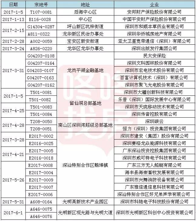 4、深圳土地基本都留给了优秀企业,这是2017年深圳比较重要的区域的土地出让情况: