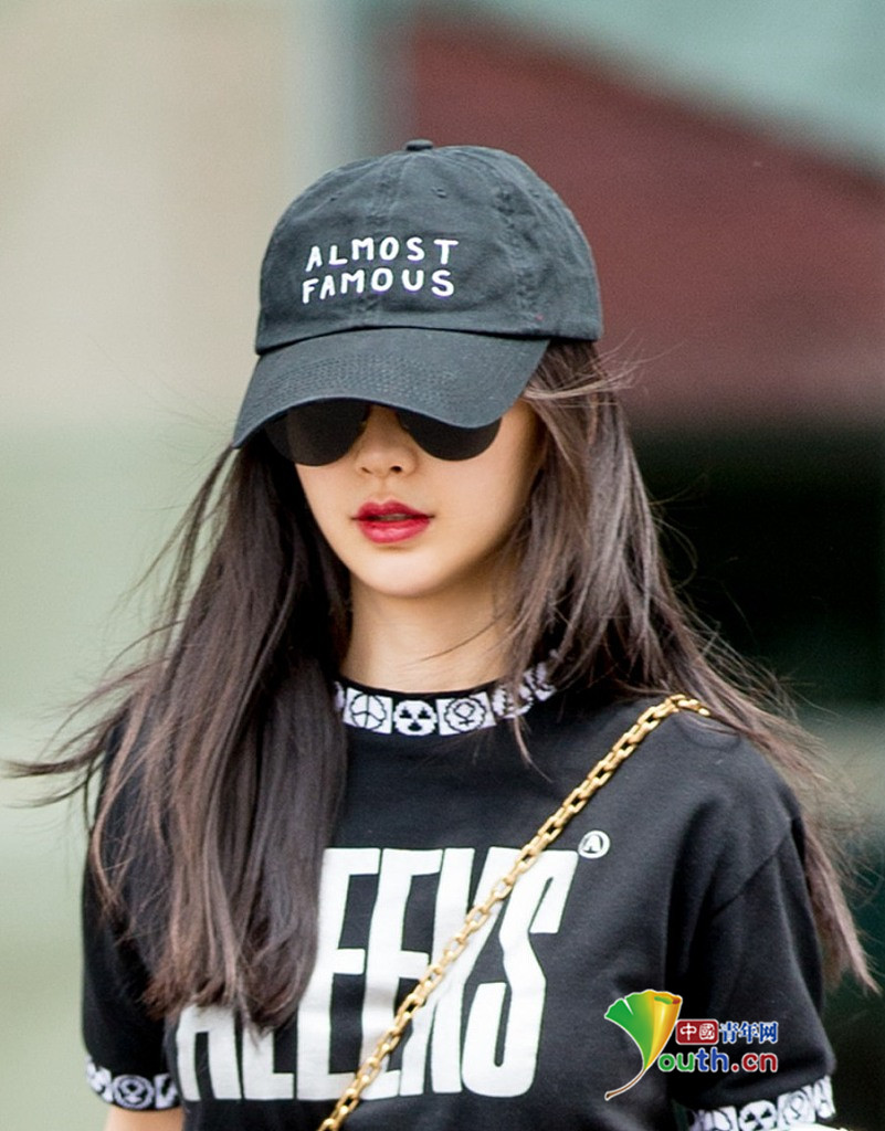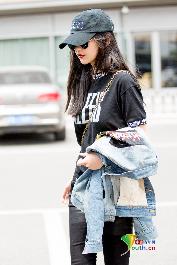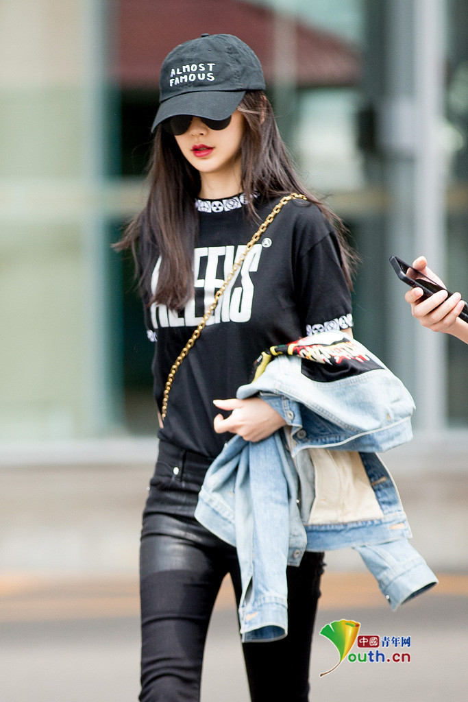 6月12日,Angelababy帅酷亮相,她抱着外套迈大步前行,双腿又直又细,夏天不走寻常路,黑墨镜、黑帽、黑T恤、黑色紧身裤帅到飞起,但脚上的粉鞋又少女心十足。