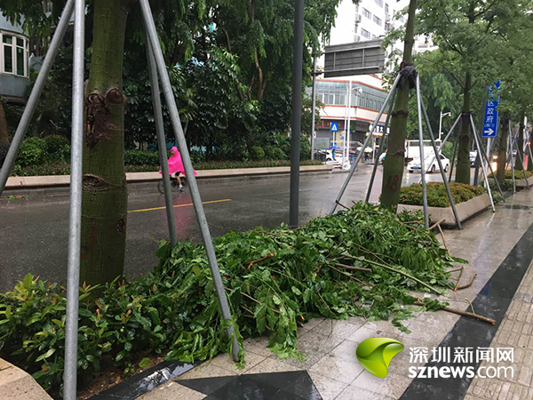 当天上午8:22时,记者来到香径南街、深盐路、海山路、海环路,看到一路都是被台风“苗柏”刮倒的树叶、树枝以及被风吹到东倒西歪的护栏。为了方便市民出行,大部分树枝已被清理到旁边。在深盐路与香径南街交汇处,水务部门正在进行井口排洪。