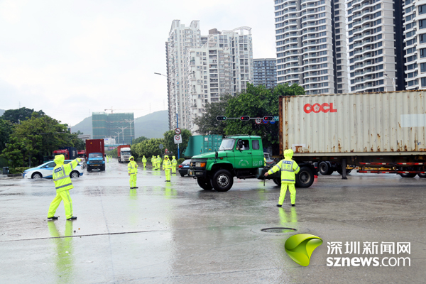 由于交通管制后的明珠立交匝道封闭,所有货柜车均从明珠大道排队进闸。上午10时30分,梧桐山大道、盐田路、明珠道北往南等,相继出现车多缓行现象。在盐田路与明珠大道交汇,记者看到, 10余名身着雨衣的交通协警正冒雨执勤。交警部门表示,为确保进港车辆需按序通行,对于货柜车司机的插队行为,将依法予以处罚,并通知码头中止该车辆在码头相关作业。