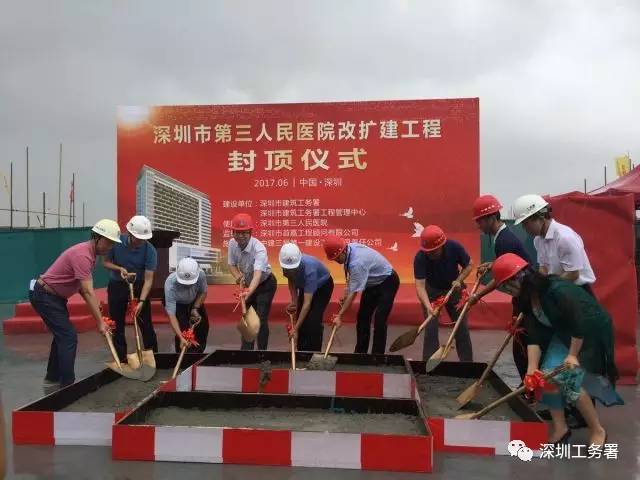 6月12日下午,深圳市第三人民医院改扩建工程项目主体结构封顶仪式在项目现场举行,工务署刘志达副署长出席仪式,工程管理中心、市医管中心、市三医院和各参建单位代表等相关人员参加仪式。