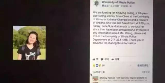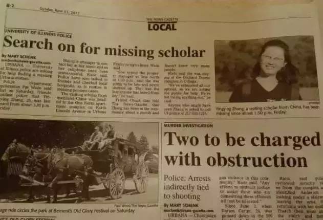 芝加哥时间6月9日14时左右,章莹颖出现在北古德温大道附近,一辆深色SaturnAstra汽车轿车停在她身侧,和司机短暂交谈后,她坐上了副驾驶座位。此后,亲人朋友都无法与她取得联系。