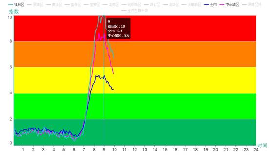 受台风苗柏影响,本日中心城区早高峰交通指数达6.2,平均速度22.1km/h,其中福田区在9点前后交通指数“爆表”;对比上周二,中心城区早高峰交通指数为3.6,平均速度31.3km/h。
