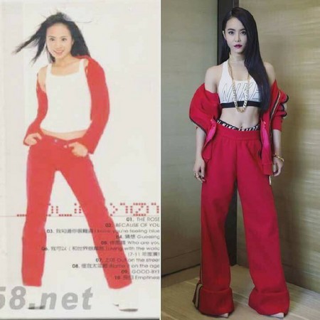 照片左侧,可以看到蔡依林1999年发行《1019》的宣传照,身穿显眼的红色外套、以及同色是的长裤,稍微拉下右侧外套,青涩中又带点小性感。对比18年后的今天,她大方拉下外套,露出纤瘦的肩膀线条,背心长度也短到胸下,展现多年的健身成果。