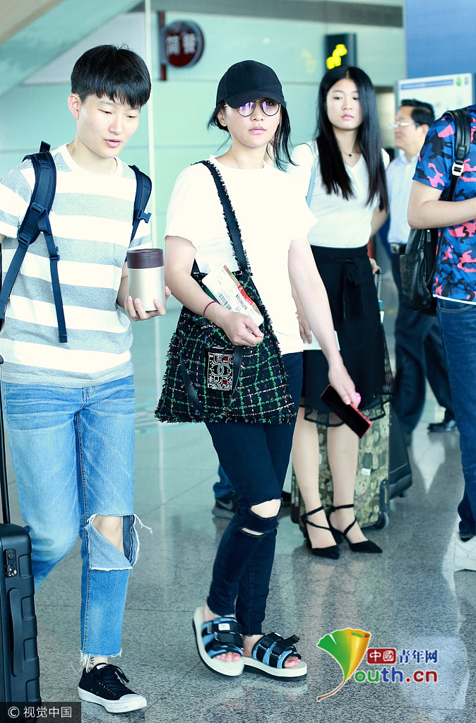 13日,周迅现身首都机场,当天她素颜赶飞机不施粉黛,白色T恤搭配黑色破洞裤休闲随性,踩舒适凉拖鞋现身的她全无明星架子,但举手投足间气质不俗。